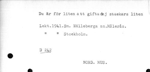 //// Du är för liten att gifta dej stackars liten //// Lekt.1941.Sm. Hålleberga sn.Målerås. //// " " Stockholm. //// NORD. MUS. ////