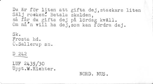 //// Du är för liten att gifta dej,stackars liten < //// Sälj rocken? Betala skulden, i //// så får du gifta dej på lördag kväll. ^ //// Om nå*n vill ha dej,som kan fördra dej. //// Sk. //// Frosta hd. //// ö.Sallerup sn. //// LUF 2435/30 //// Uppt.W.Richter. //// NORD. MUS. ////