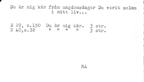 //// Du är mig kär från ungdomsdagar Du varit solen //// i mitt liv... //// j //// i //// B 29, s.150 Du är mig kär. 3 str. //// B 40,s.32 " " " " 3 str. //// r //// ! //// b //// t //// * ! //// } //// RA ////