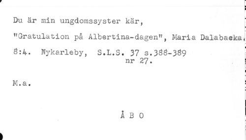 //// Du är min ungdomssyster kär, j //// "Gratulation på Albertina-dagen", Maria DalabaekaJ //// 8:4. Nykarleby, S.L.S. 37 s.388-389 ' //// nr 27. j //// E //// M.a. ! //// 5 //// i //// A B 0 //// *-* - ////