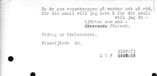 //// Du är som rosenknoppen så vacker och så röd,; //// för din skull vill jag leva å för din skull //// vill jag dö - //// ! hjärtat som snö - //// iäxs^gHHgx fästemö* //// Utdrag ur Kärleksbrev, //// Vissafjärda Sm, //// 3593:73 //// ^ L U F ////