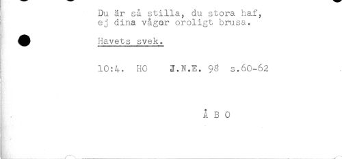 //// Du är så stilla, du stora haf, //// ej dina vågor oroligt brusa. //// ! ^ Havets svek. //// j 10:4^ HO 3.N.E. 93 s.60-62 //// ÅBO ////