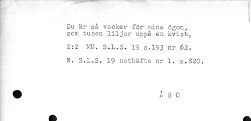//// f //// ^ . ... . //// Du är så vacker för mina ögon, //// som tusen liljor uppå en kvist, //// * //// 2:2 MU. S.L.S. 19 s.193 nr 62. //// N. S.L.S. 19 nothäfte nr 1. s.820. ////