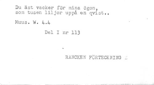 //// Du äst vacker för mina ögon, //// som tusen liljor uppå en qvist.. //// * //// Muus. W. 4.4 //// Del I nr 113 //// * //// RANCKEN FÖRTECKNING ^ //// \.... ....... .....----.----___< ////