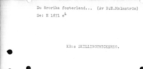 //// Du ärorika fosterland... (Av B.E.Malmström) //// Se: E 1871 e^ //// . //// KB:s SKILLINGTRYCKSREG. ////