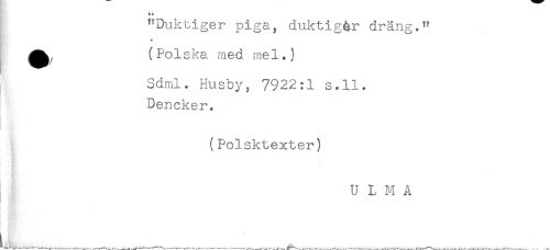 //// * * //// "Duktiger piga, duktigår dräng." //// * //// (Polska med mel.) //// Sdml. Husby, 7922:1 s.ll. //// Dencker. //// (Polsktexter) //// : U L M Ä ////