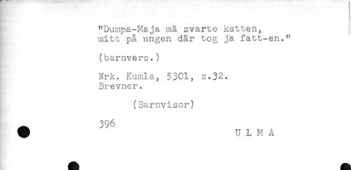 //// - , * //// "Dumpa-Maja mä svarte katten, //// mitt på ungen där tog ja fatt-en." //// -. //// (barnvers.) //// Nrk. Kumla, 5301, s.32. //// Brevner. //// (Barnvisor) //// ^ 396 //// # U L M A ////