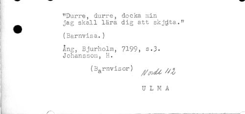 //// "Durre, durre, docka min //// [ jag skall lära dig att skjuta." //// (Barnvisa.) //// j Ang, Bjurholm, 7199, s.3< //// Johansson, H. //// ! (Barnvisor) ^^^ //// U L M A //// ____^___. - ////