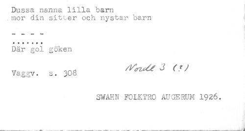 //// Dussa nanna lilla oarn //// mor din sitter och nystar barn //// E //// < //// * + * 4 $ * t //// Där gol göken //// Vaggv. s. 308 //// SWAHN FOLKTRO AUGERUM 1926. ////