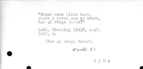 //// f ' ' ' . ' //// ..... -- - -- - - - //// .... ... //// ^'Dussa nana lilla barn, //// stort i roven som en kvarn, //// har så många fararf^ //// . //// Smal. Tävelås^. 15238, s.47. //// Hult, A. //// (Har så många farar). //// * //// U L M A ////