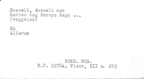 //// Dusseli, dusseli aga //// Katten to^ Herrys kaga *.. //// (vaggvisa) //// Sk //// Allerum //// NORD. MUS. //// E.U. 19764, Visor, III s. 223 ////