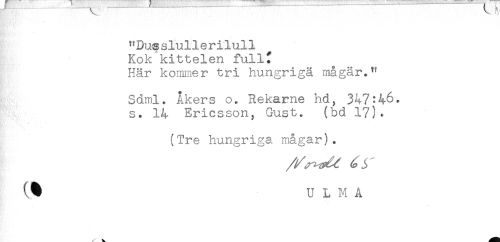 //// "Dusslullerilull //// Kok^kittelen fullt //// Här konmier tri hungrigä mågärj' //// Sdml. Åkers o. Rekarne hd, 347^46. //// s. 14 Ericsson, Gust* (bd 17). //// (Tre hungriga mågar). //// (t U L M Å ////