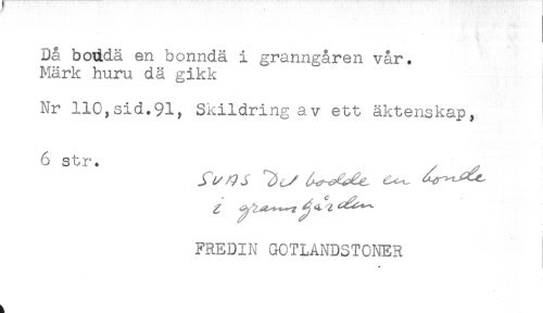 //// Då boddä en bonndä i granngåren vår. //// Märk huru dä gikk //// Nr 110,sid.91, Skildring av ett äktenskap, //// 6 str. //// FREDIN GOTLANDSTONER ////