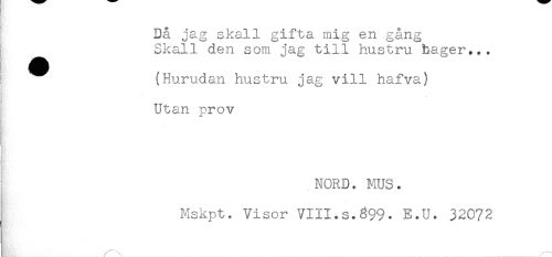 //// Då jag skall gifta mig en gång //// I Skall den som jag till hustru häger... //// ! ^^ (Hurudan hustru jag vill hafva) //// < //// Utan prov //// j //// NORD. MUS. //// Mskpt. Visor VIII.s.899. E.U. 32072 ////
