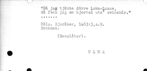 //// "Då jag tjänte därre Loka-Lasse, //// då feck jag en kjortel uta' svinahår." //// Häls. Bjuråker, 1463^3?s.9* //// Backman. //// (Danslåtar). //// ; ////
