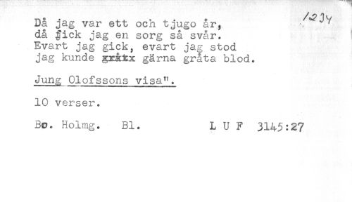 //// Då jag var ett och tjugo år, ^ //// då #ick jag en sorg så svår. ! //// Evart jag gick, evart jag stod //// jag kunde gxåtx gärna gråta blod. //// Jung Olofssons visa". //// 10 verser. //// Bo. Holmg. Bl. L U F 3145:27 ////
