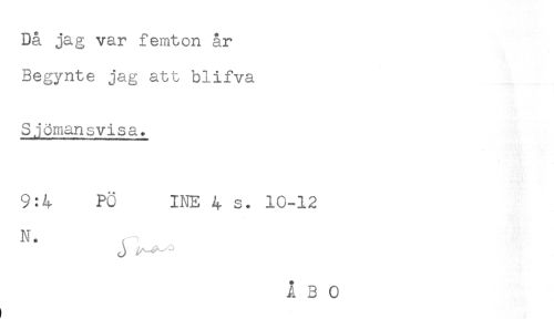 //// Då jag var femton år //// Begynte jag att blifva //// Sjömansvisa. //// 9:4 PO INE 4 s. 10-12 //// N * r ^ ////
