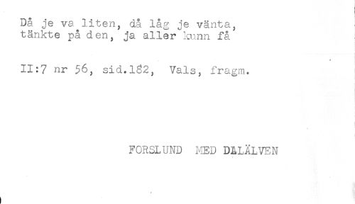 //// Då je va liten, då låg je vänta, //// tänkte på den, ja aller kunn få //// ! //// i* //// * t //// 11:7 nr 56, sid.Ig2, Vals, fragm. //// . //// i //// i //// 1 //// < //// i //// ! //// FORSLUND MED DALÄLVEN ////