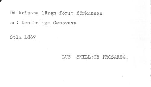 //// Då kristna läran först förkunnas //// se: Den heliga Genoveva //// t //// Stim 1867 //// LUB SKILL:TR PROSAREG. ////