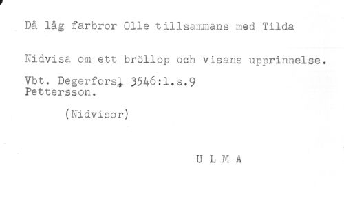 //// Då låg farbror Olle tillsammans med Tilda //// Nidvisa om ett bröllop och visans upprinnelse. //// Vbt. Degerfors; 3546:1.s.9 //// Pettersson. //// (Nidvisor) ////