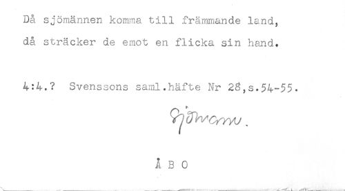 //// Då sjömännen komma till främmande land, //// då sträcker de emot en flicka sin hand. //// Svenssons saml.häfte Nr 23,s.54-55. //// ÅBO ////