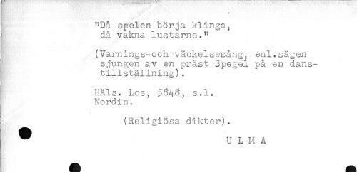 //// K ; ' . //// "Då spelen börja klinga, //// I då vakna lustarne," //// § ^ (Varnings-och väckelsesång, enl.sägen //// sjungen av en präst Spegel på en dans- //// tillställning) . //// Häls. Los, 5843, s.l. //// Nordin. //// - //// (Religiösa dikter). //// ^ U L M A ////