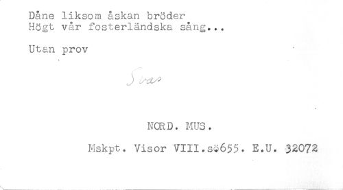//// Dåne liksom åskan bröder //// Högt vår fosterländska sång... //// Utan prov //// * //// * //// NORD. MUS. //// Mskpt. Visor VIII.sc655. E.U. 32072 //// - ////