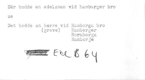 //// Där bodde en adelsman vid hamburger bro //// se //// Det bodde en herre vid Hamborga bro //// (greve) Hamberger //// Hornborga //// Hanborje ////
