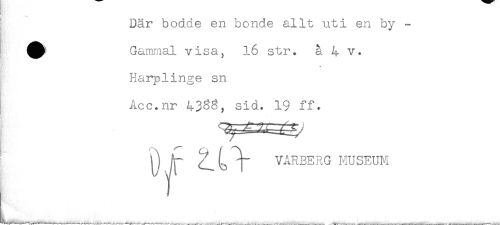 //// Där bodde en bonde allt uti en by - //// Gammal visa, 16 str. å 4 v. //// * //// Harplinge sn //// Acc.nr 43^3, sid. 19 ff. //// ^ VARBERG MUSEUM ////