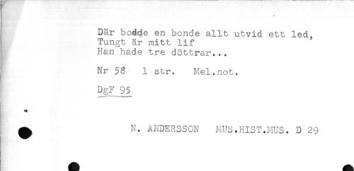 //// Där bodde en bonde allt utvid ett led, //// Tungt är mitt lif //// Han hade tre döttrar... //// Nr 58 1 str. Mel.not. //// DgF_95 //// ** //// ^ N. ANDERSSON MUS.HIST.MUS. D 29 ////
