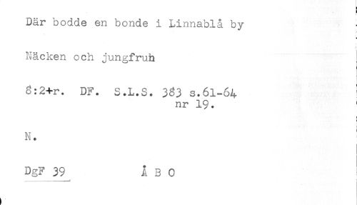 //// Där bodde en bonde i Linnablå by } //// Näcken och jungfruh //// 3:2+r. DF. S.L.S. 333 s.61-64 //// nr 19. //// ) //// ) //// N. //// DgF 39 ÅBO ////