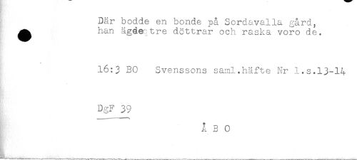//// Där bodde en bonde på Sordavalla gård, //// ^^ han ägde* tre döttrar och raska voro de. //// 16:3 BO Svenssons saml.häfte Nr l.s.13-14 //// DgF 39 //// A B 0 ////