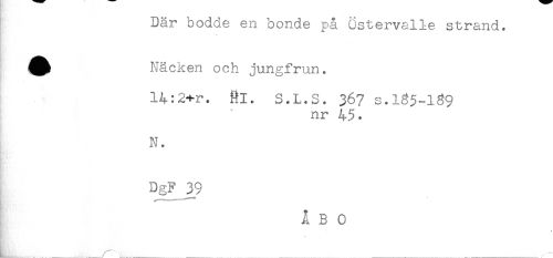 //// Där bodde en bonde på östervalle strand. //// ^^ Näcken och jungfrun. //// 14:2+r. Rl. S.L.S. 367 s.165-139 //// nr 45. //// N. //// DgF 3_9 //// ÅBO //// L_____ ....., _ _ . ___. , - ////