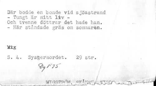 //// Där bodde en bonde vid sjöastrand //// - Tungt är mitt liv - //// Och tvenne döttrar det hade han. //// - Här ståndade gräs om sommaren. //// Xig //// S. 4* Sys^ermordet. 29 str. ////
