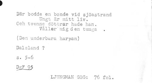 //// Där bodde en bonde vid sjöastrand //// Ungt är mitt liv^ //// Och tvenne döttrar hade han. //// Väller'mig den tunga //// ! //// (Den underbara harpan) //// Dalsland ? //// s. 5-6 //// LJUNGMAN GBG: 76 fol. ////