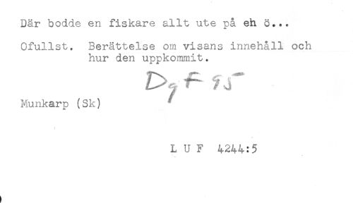 //// Där bodde en fiskare allt ute på eh ö... //// Ofullst. Berättelse om visans innehåll och //// hur den uppkommit. //// Munkarp (Sk) //// L U F 4244:5 ////