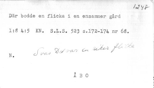 //// Där bodde en flicka i en ensammer gård //// - //// 1:6 4:5 KN. S.L.S. 523 s.172-174 nr 66. //// ! //// L //// i //// N. J ^^ //// ÅBO ////