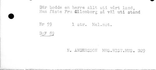 //// Där bodde en herre allt uti vårt land, //// Han fäste Fru Ollonborg så väl uti stånd //// Nr 59 1 str. Mel.not. //// DgF gg //// N. ANDERSSON MUS.HIST.MUS. D29 ////