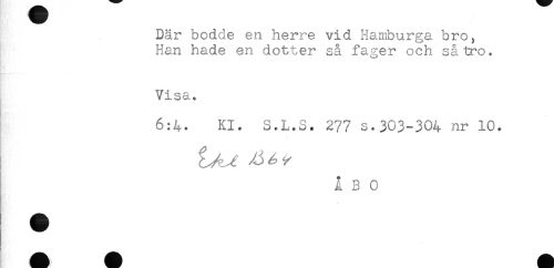 //// Där bodde en herre vid Hamburga bro, //// Han hade en dotter så fager och så tro. //// M- //// Visa. //// 6:4. Kl. S.L.S. 277 s.303-304 nr 10. //// ÅBO ////