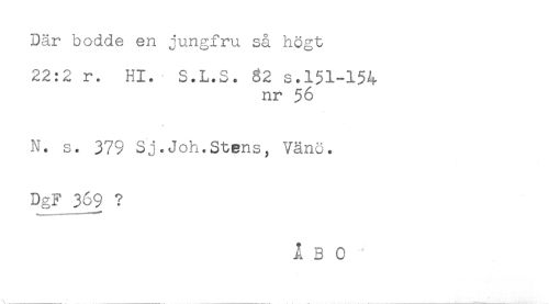 //// Där bodde en jungfru så högt //// 22:2 r. Hl. S.L.S. 62 s.151-154 //// nr 56 //// * //// N. s. 379 Sj.Joh.Stens, Vänö. //// DgF %9 ? //// ÅBO ////