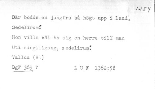//// Där bodde en jungfru så högt upp i land, //// .... i //// Sedelirumf //// Hon ville väl ha sig en herre till man i //// Uti singiligang, sedelirumt //// Valida (Hl) //// ^369? LUF 1362:5^ //// ] //// < //// < ////