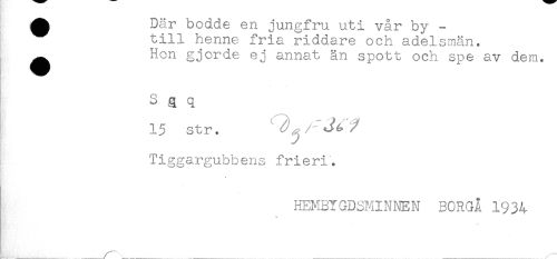 //// ^ Där bodde en jungfru uti vår by - //// till henne fria riddare och adelsmän. //// ^ Hon gjorde ej annat än spott och spe av dem. //// S a q //// 15 str. //// Tiggarguhbens frieri'. //// HEMBYGDSMINNEN BORGÅ 1934 //// L , . ......r^*-, _ _____ ////