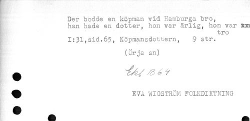 //// . //// Der bodde en köpman vid Hamburga bro, //// han hade en dotter, hon var ärlig, hon var Äx //// E- * tro //// 1:31,sid.65, Köpmansdottern, 9 str. //// (örja sn) //// ^ EVÅ WIGSTRCK FOLKDIKTNING ////