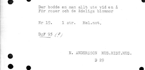 //// Der bodde en man allt ute vid en å //// För roser och de ädeliga blommor //// Nr 19. 1 str. Mel.not. //// DgF_95 //// ^ N. ANDERSSON MUS.HIST.MUS. //// D 29 ////