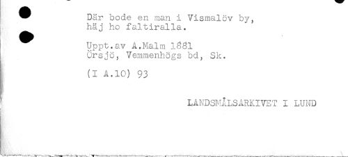 //// ^ Där bode en man i Vismalöv by, //// häj ho faltiralla. //// ! Uppt.av A.Malm l3gl //// ! Örsjö, Vemmenhögs bd, Sk. //// (I A.10) 93 //// ' LAKDSMÅLSARKIVET I LUND //// I ////