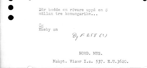 //// ^ Där bodde en rövare uppå en ö //// ^^ mällan tre konungarike... //// Ög //// Ekeby sn //// - //// NORD. MUS. //// Mskpt. Visor I.s. $37- E.U.362O. ////