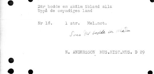 //// Där bodde en skälm ibland alla //// Uppå de omyndiges land //// sy' //// Nr 1 str. Mel.not. //// N. ANDERSSON MUS.HIST.MUS. D 29 ////