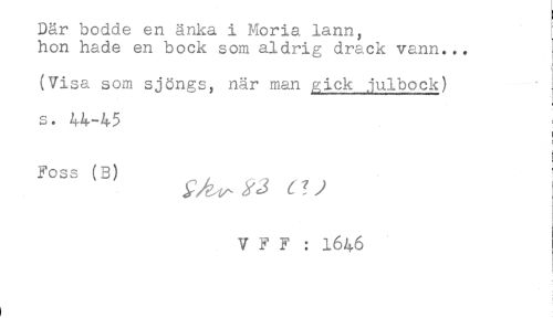 //// Där bodde en änka i Moria lann, //// hon hade en bock som aldrig drack vann... //// t //// ! //// (Visa som sjöngs, när man gick julbock) //// s. 44-45 //// < //// ! //// Foss (B) , , ' //// V F F : 1646 ////