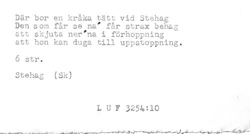 //// Där bor en kråka tätt vid Stehag //// Den som får se na* får strax behag //// att skjuta ner*na i förhoppning //// att hon kan duga till uppstoppning. //// 6 str. //// Stehag (Sk) //// L U F 3254^10 ////