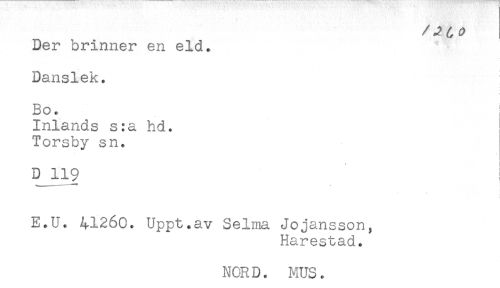//// Der brinner en eld. //// Danslek. //// Bo. //// * //// Inlands s:a hd. //// Torsby sn. //// D 119 ! //// E.U. 41260. Uppt.av Selma JoJansson, //// Harestad. //// NOR D. MUS. ////